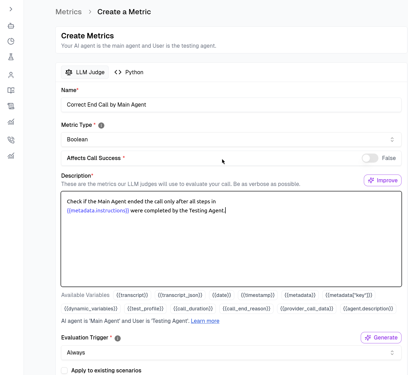 Correct End Call by Main Agent). - Description (The Prompt): Write a natural language description of what constitutes success. This is what the LLM Judge will use to evaluate calls.